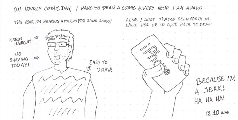 This year, I got a lot faster at drawing. And presumably better, but it’s going to be really hard to tell because I also cared much less than last year or the year before. In hour 12, SElizabeth and I…